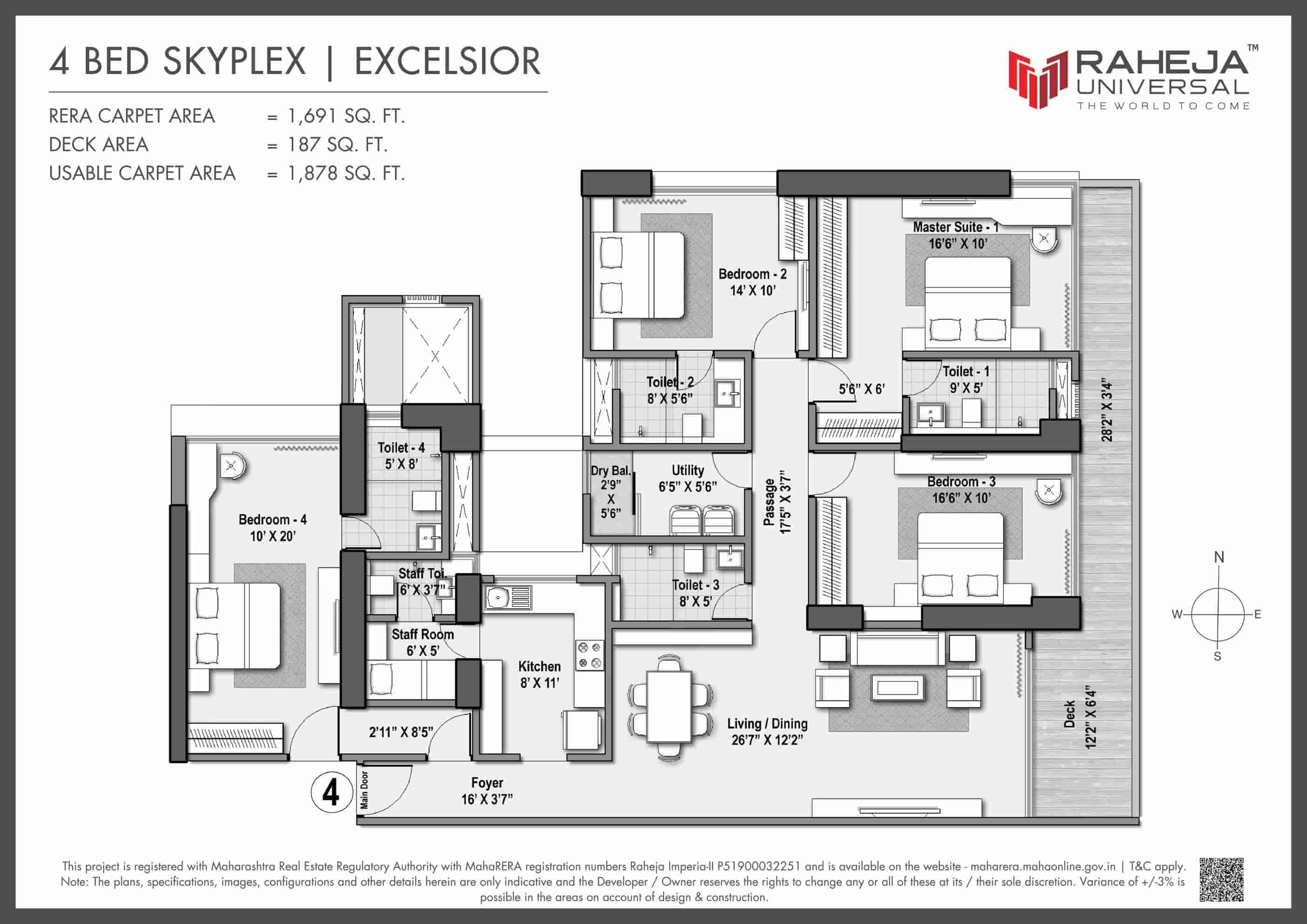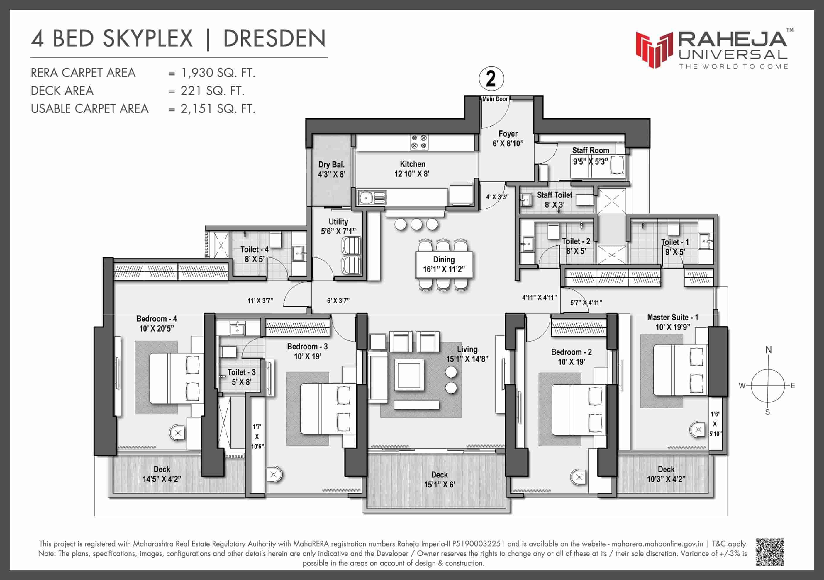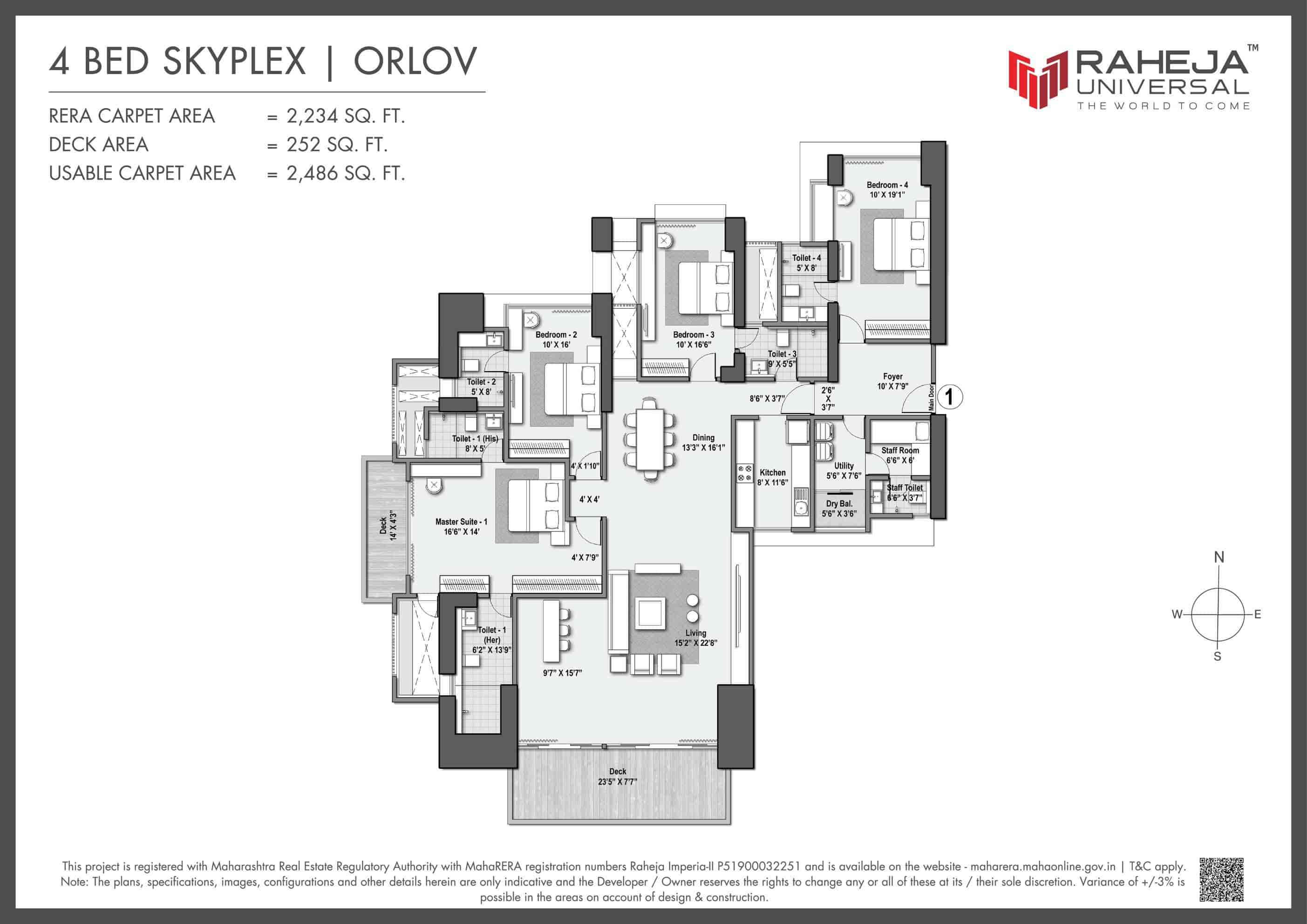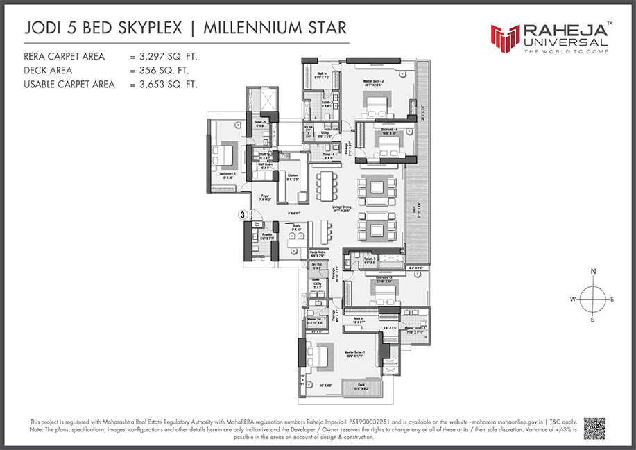 Explore detailed layouts of 3, 4 & 5 BHK Skyplex residences with wrapped decks, ranging from 1,586 to 3,297 sq.ft carpet area